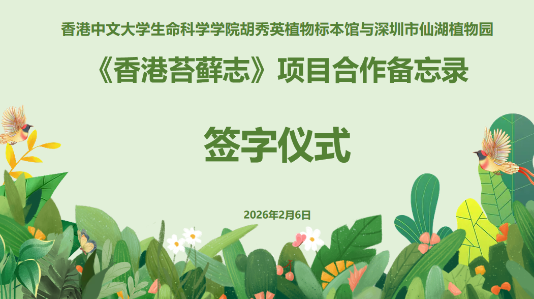 2026年2月6日,深圳市仙湖植物园与香港中文大学生命科学学院胡秀英植物标本馆合作签约仪式在仙湖植物园举行。胡秀英植物标本馆馆长刘大伟博士与仙湖植物园主任罗栋博士代表双方签署协议,共同启动《香港苔藓志》编研项目。